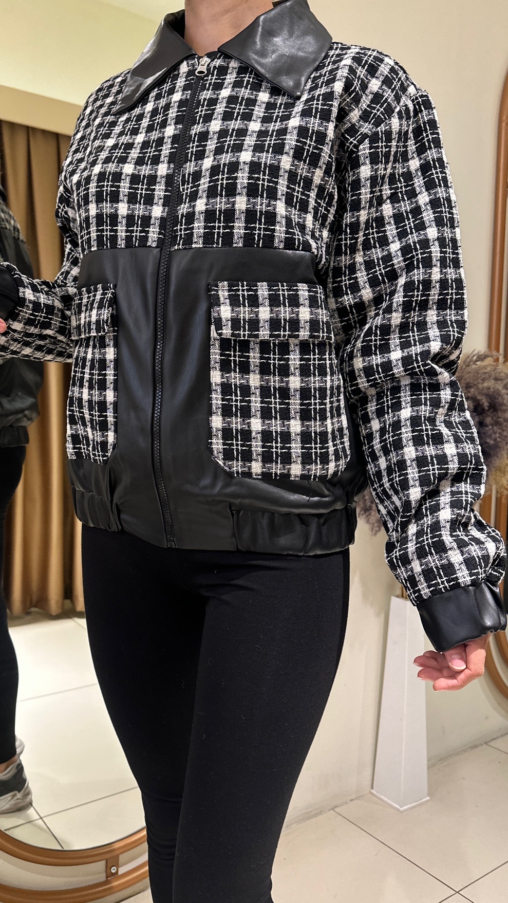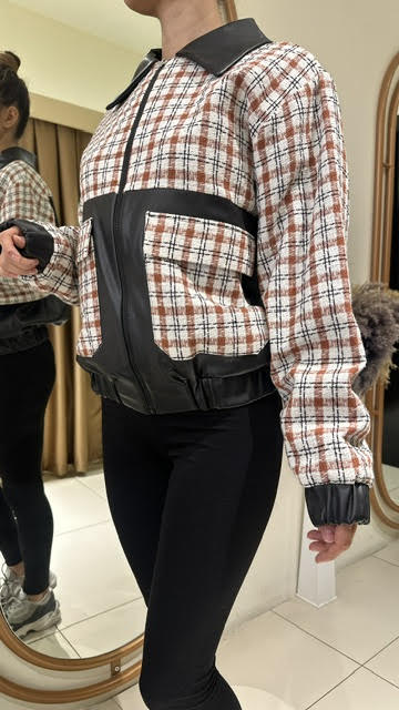 Deri detaylı fermuarlı ekose ceket